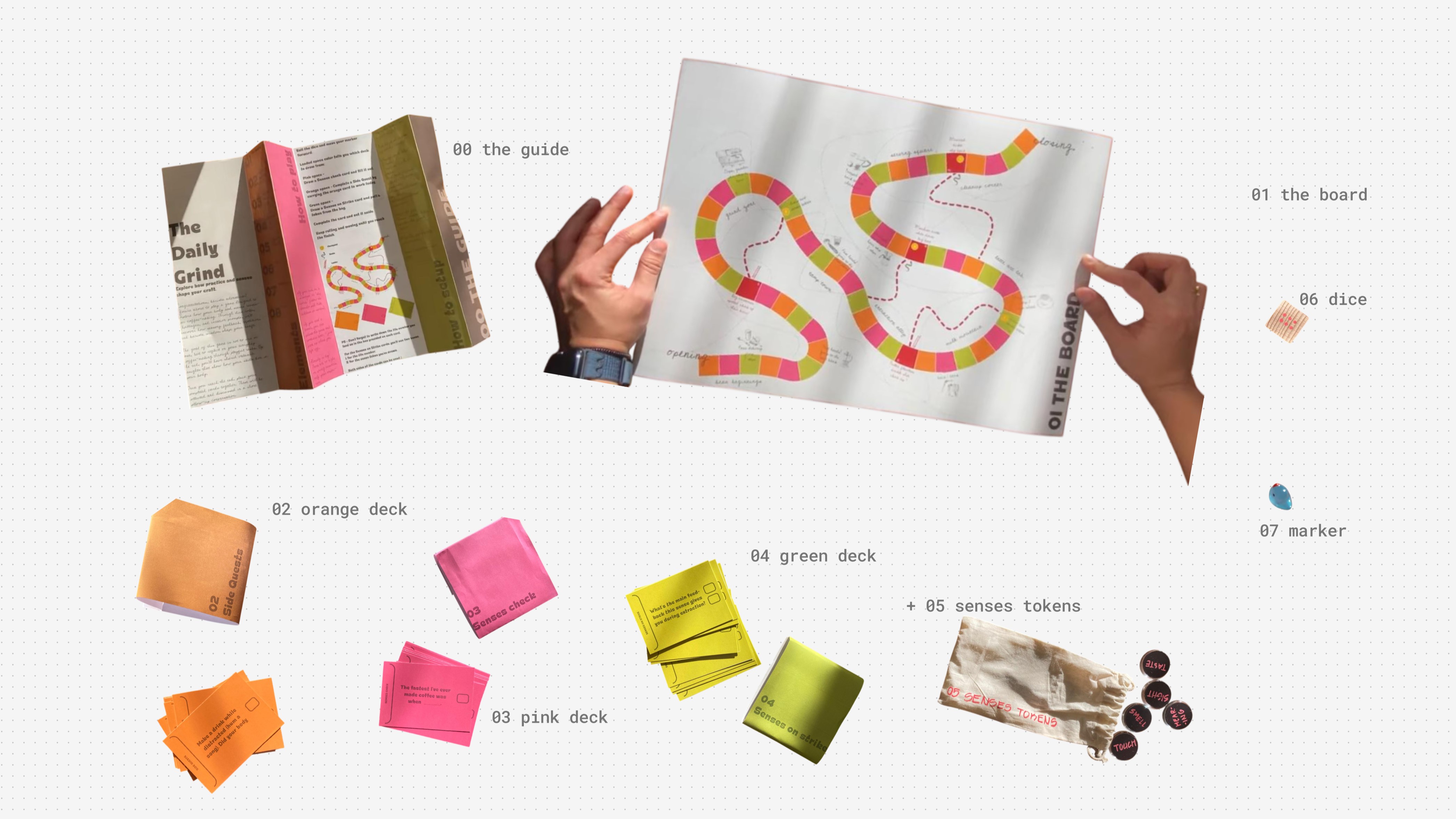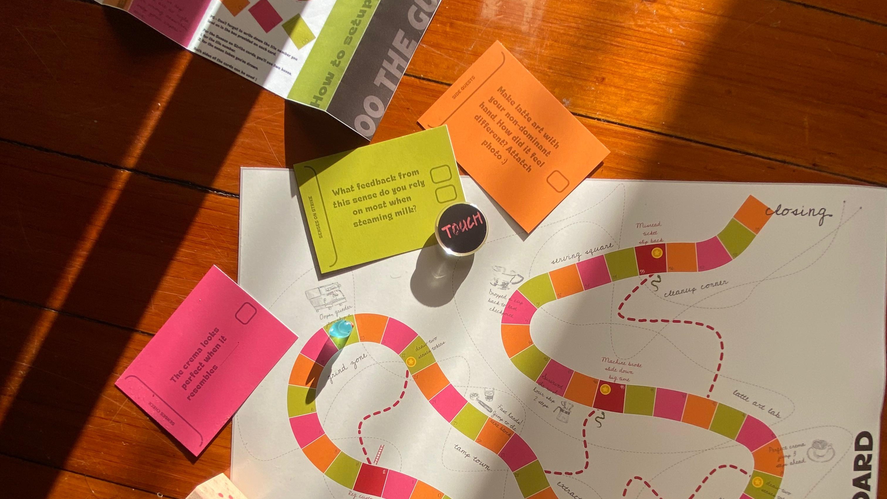 A board-game probe kit that used play, randomness, and defamiliarisation to surface the tacit, bodily knowledge of professional baristas, the kind of expertise that lives in hands and muscle memory, not words.