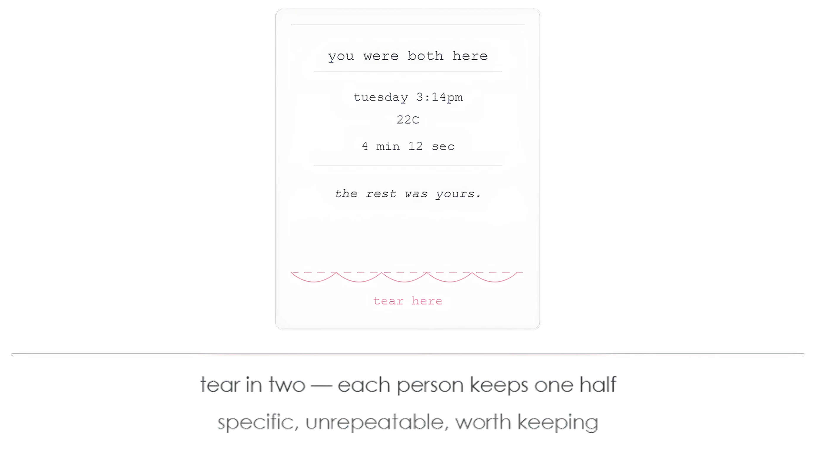 Comma is a small portable wooden box that sits between two strangers. It detects when two people sit down and ten seconds later, it starts printing. Nobody pressed anything. Nobody opted in. The box just begins. The social risk transfers from the people to the object.
